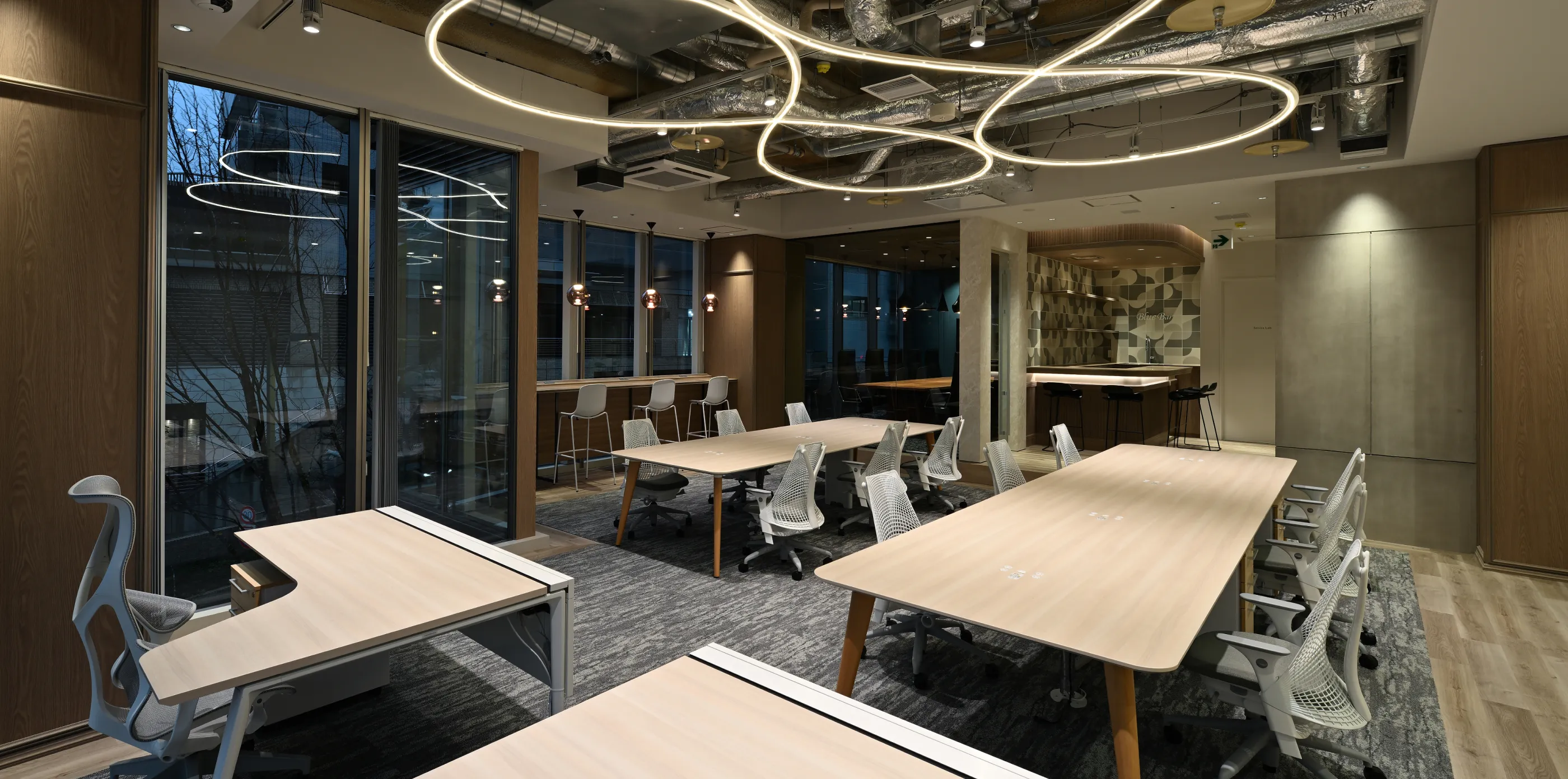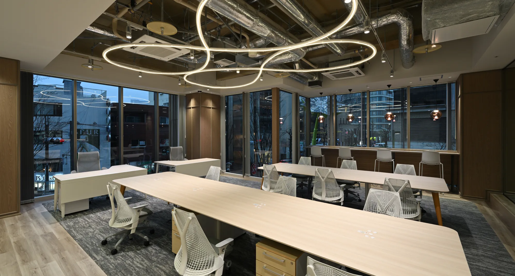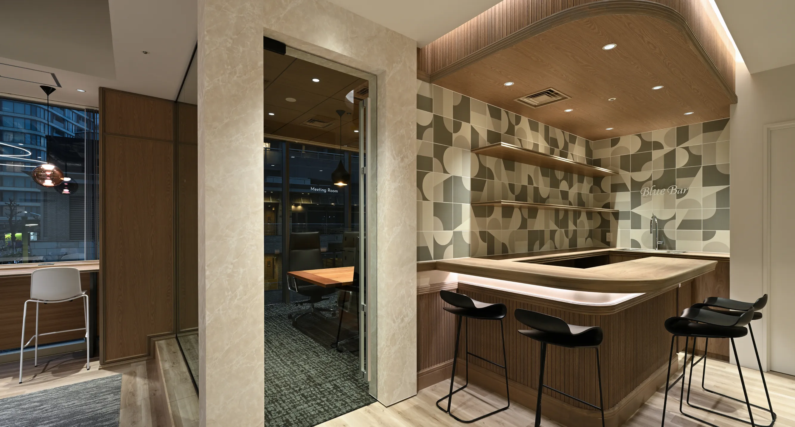 コロナ禍を経て働くことのあり方が再定義され、多様化し、暮らしの中における仕事とその他の境界はシームレスになりつつある。ワーク機能だけではなく、バーカウンターを中心としたコミュニケーションエリア+第2ミーティングエリアをオフィスの中心に設けることで、遊ぶように働き、暮らすように働く。柔軟にギアの切り替えのできるニュートラルな位置にいることの重要性に対して、デザインとゾーニングの両面からアプローチを行った。