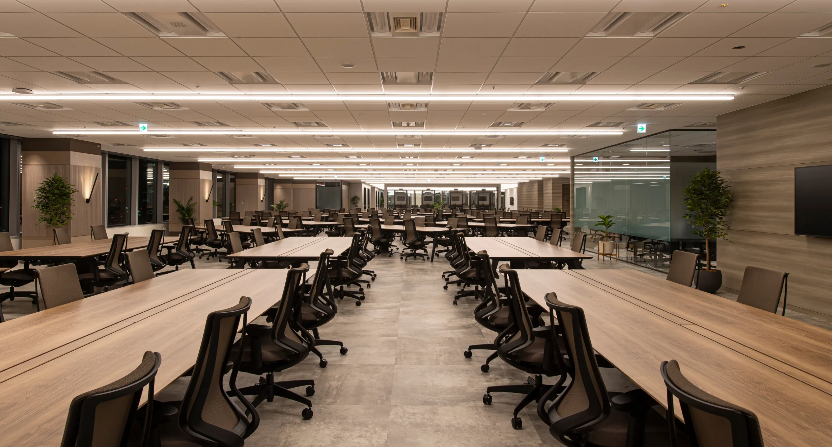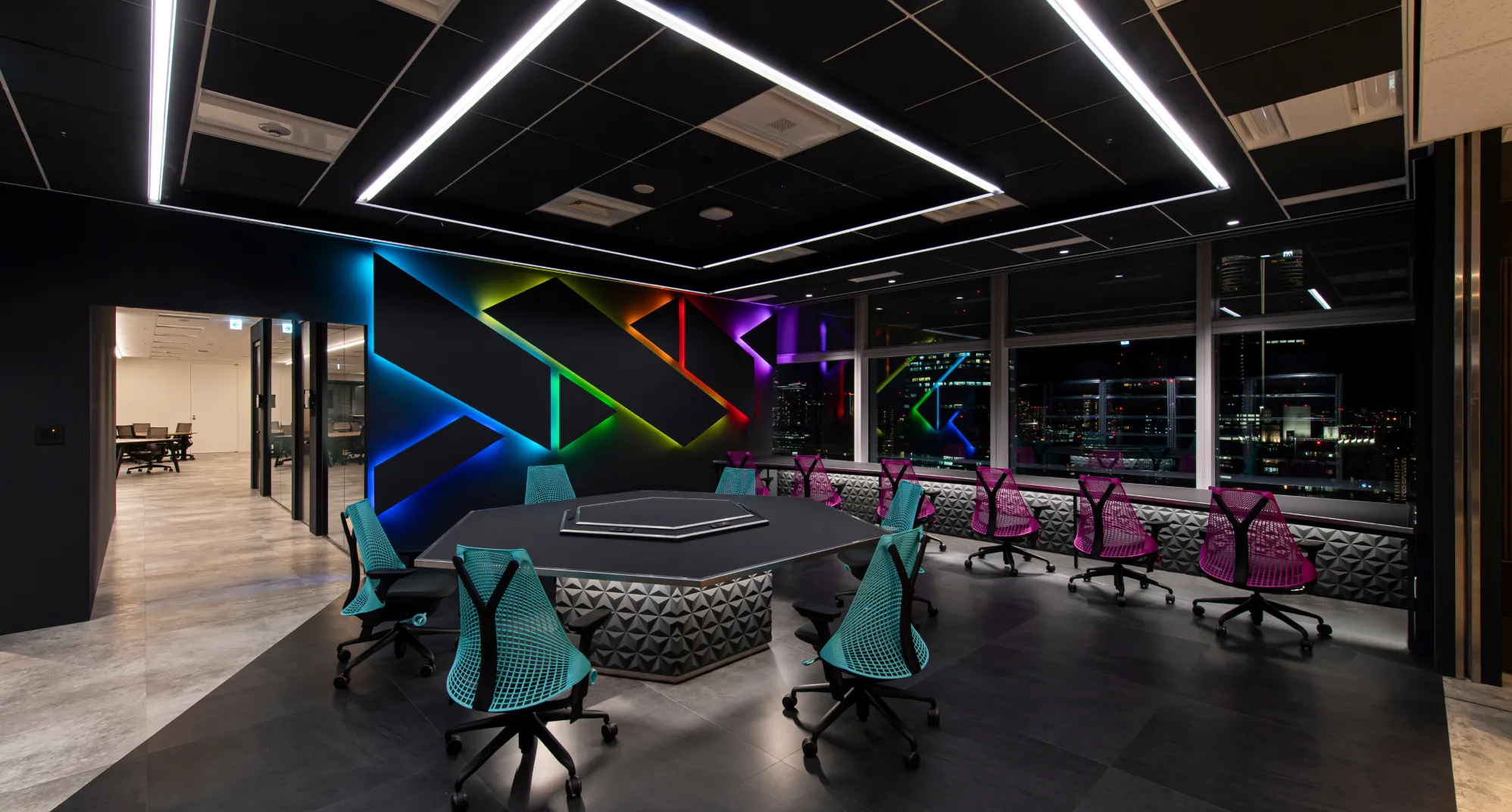 彼らの新しいオフィスに求められたのは、企業の成長性と技術力を伝える空間デザインと、ITシステムによってチームプロジェクトを促進するオフィス環境整備だった。そこで「illuminate our future(日本の未来を照らす)」をコンセプトに据え、最新技術がもたらす感動をオフィスデザインを通して表現し、「光」を使ったワクワクする体験とスムーズな業務フローの実現を図った。