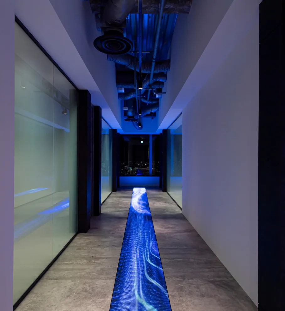グループワークが多い働き方に合わせて個人席は300席以下に抑え、約1000坪の大空間の半分をゲストエリア、会議スペース、フォーカスエリアに分配した。最大の特徴は、透過型LEDビジョンを活用したゲストエリアだ。訪問者が受付の端末をタッチすると、透過型ビジョンにロゴマークと美しい光の映像が浮かび上がり、その映像が8つの会議室のガラス壁面をゆるやかに伝って予約した会議室まで誘導する。有機的な光の動きは、無機質な空間にエネルギーを与え、訪れる人に創造的な体験を提供している。また、照明の色温度が集中力や創造的思考の向上に有効であるというデータに基づき、目的に応じて最適な色温度に設定できる高機能照明を会議エリアに導入。