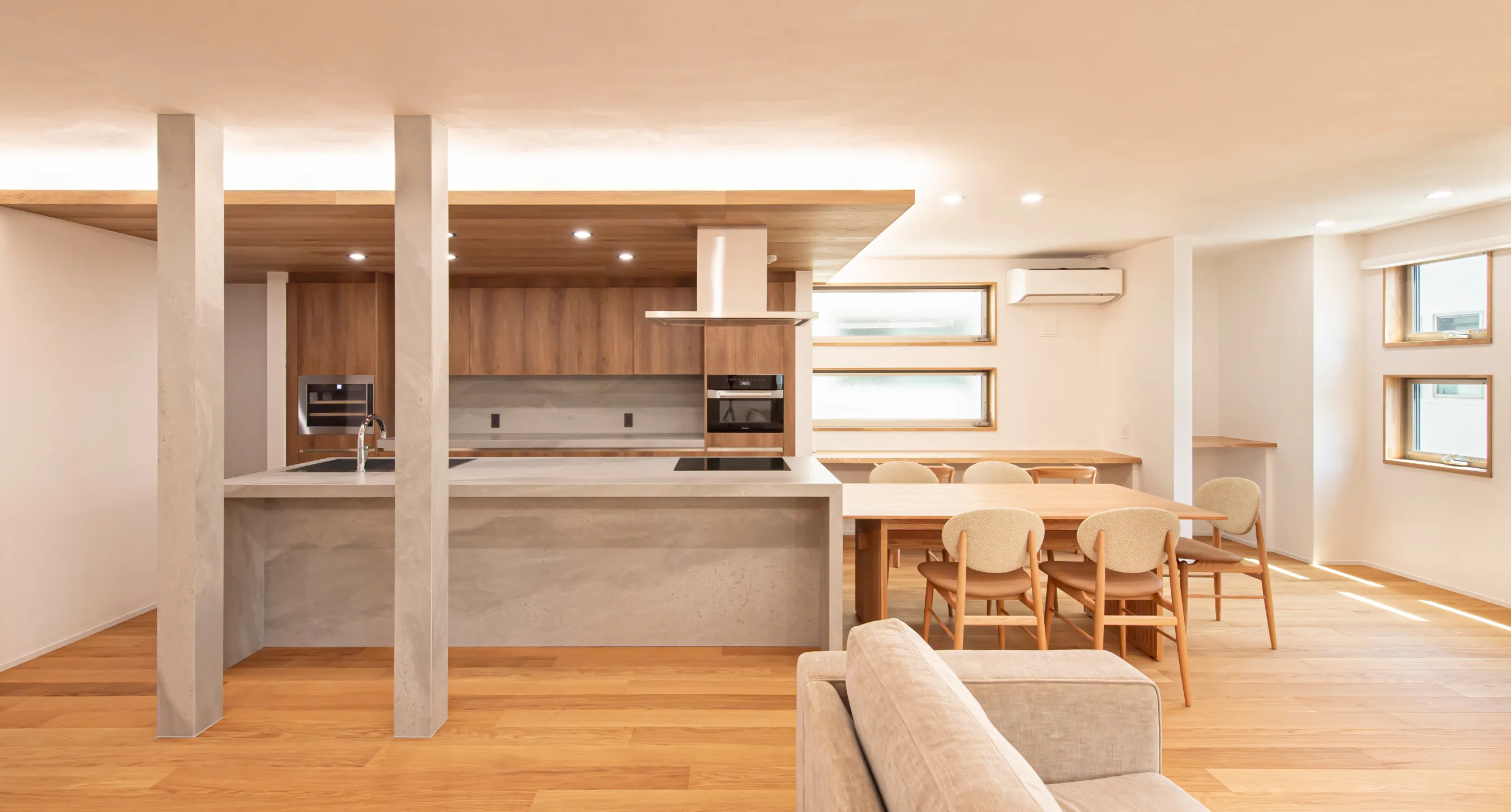 仕上げは鎌倉漆喰をメインとして機能とデザインの両立を意識し、木のもつ温かさを加えいつまでも過ごすことのできる質の高い暮らしを実現している。