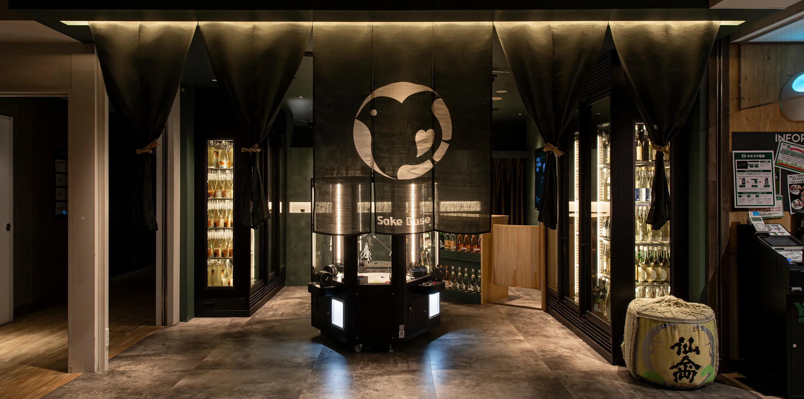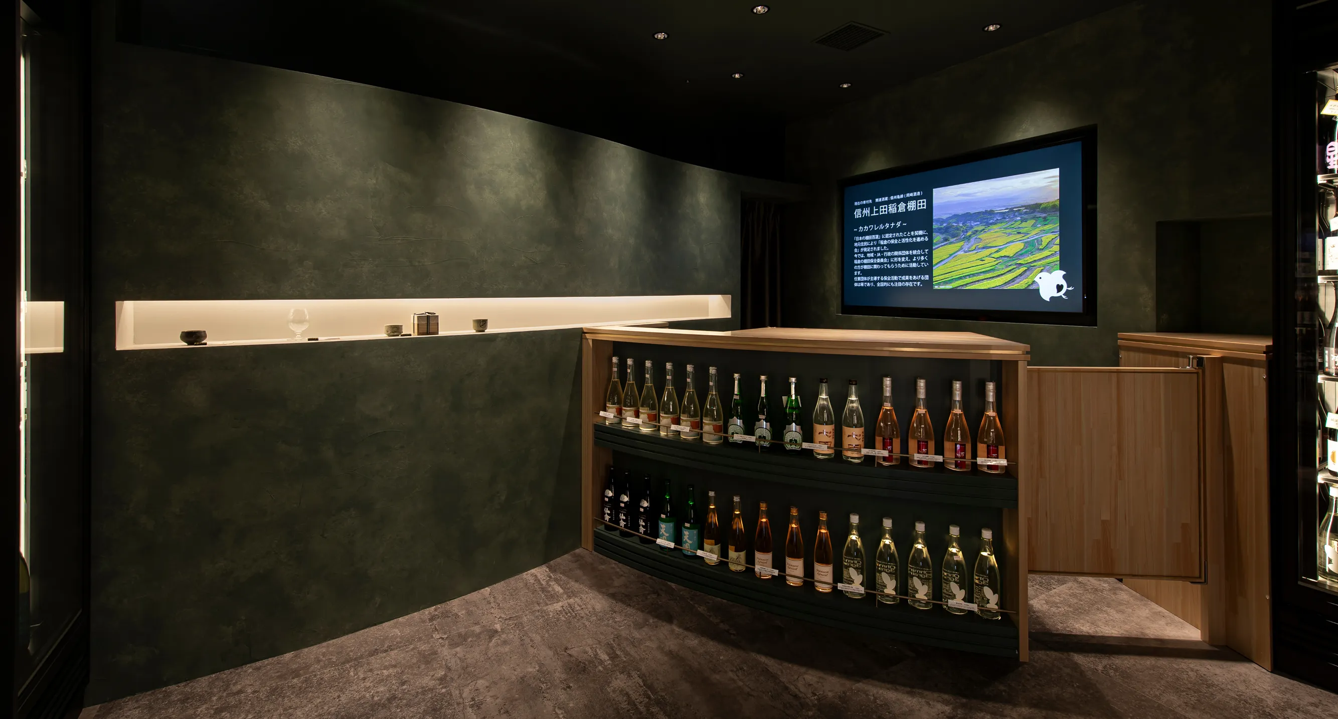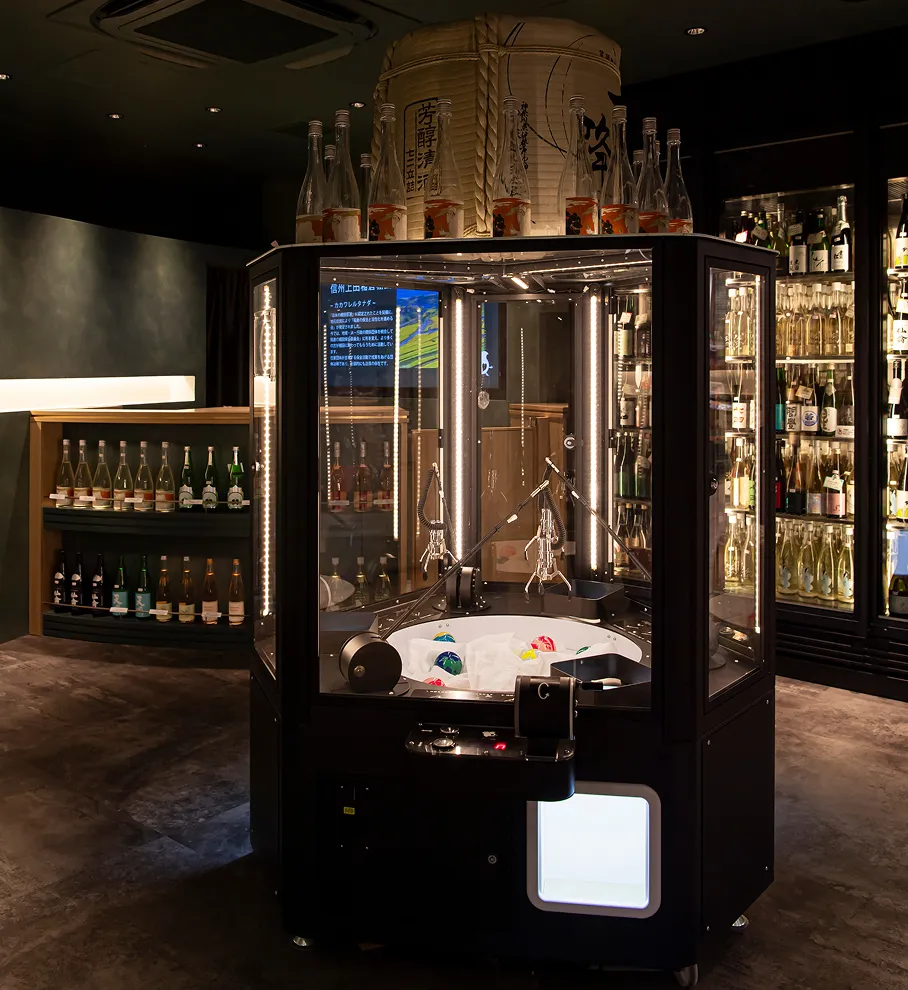 クレーンゲーム機制作メーカーの協力により既製品をデザインテーマに合わせてシックなブラックで仕上げた。作家物のお猪口などを飾れる細長いニッチや、底面に照明のついた酒瓶陳列棚など、日本酒を様々な角度から楽しめる空間となっている。