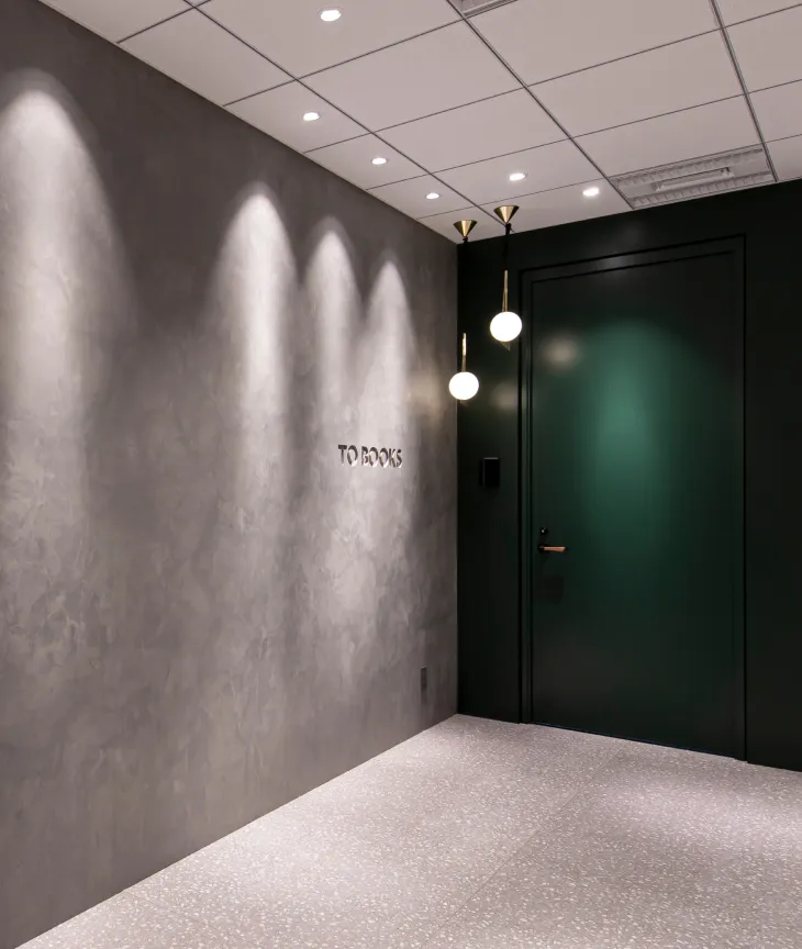 店舗デザインは森の中の大人の秘密基地をイメージし、全体的にグリーンで統一。店頭には長めの暖簾を設け、酒販店らしさと共に、暖簾をくぐる際のわくわく感を演出している。