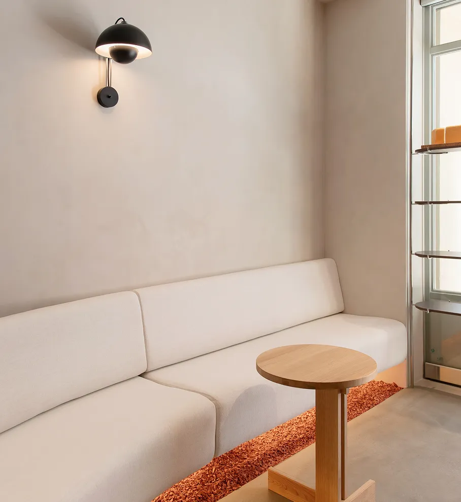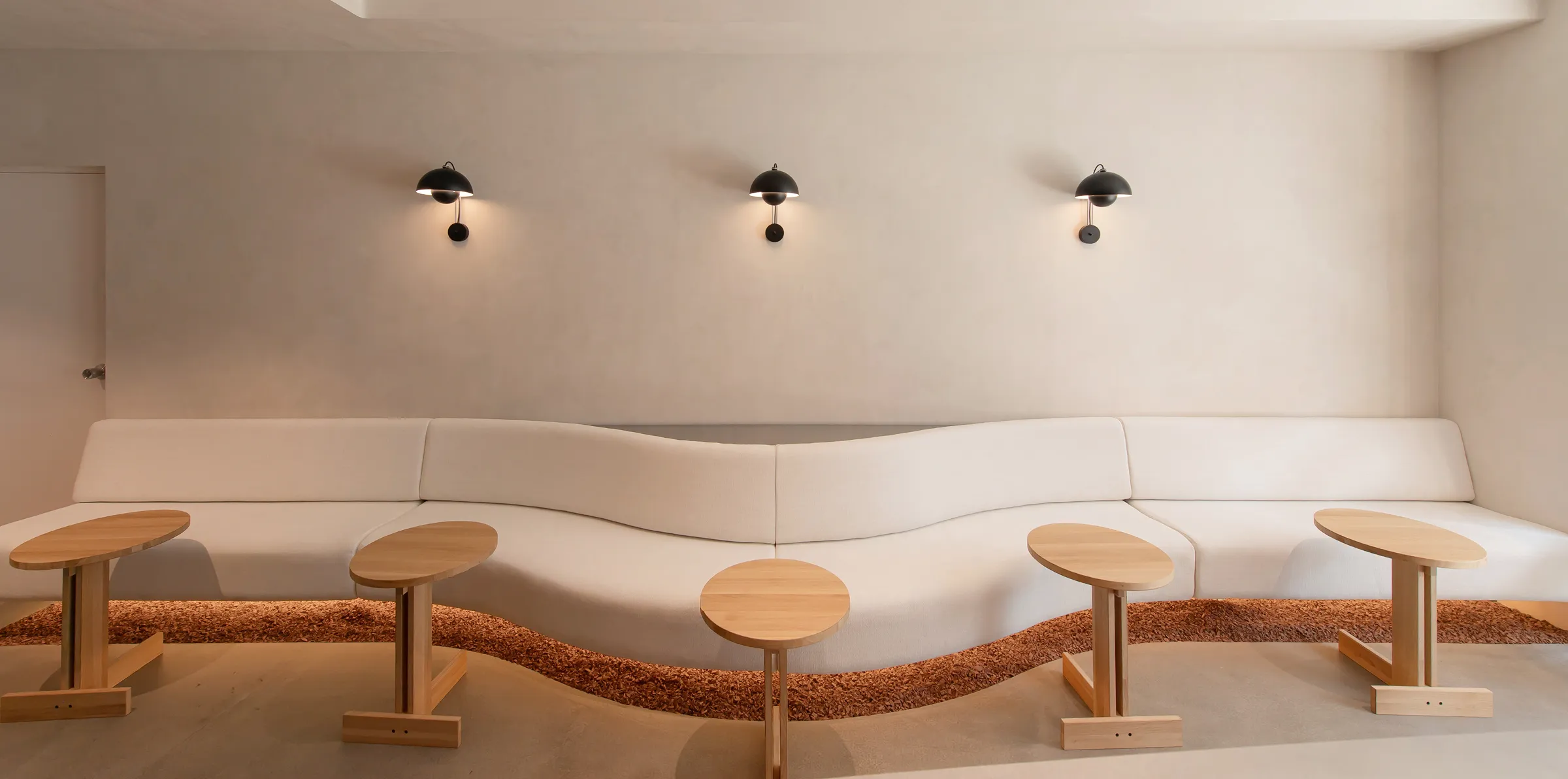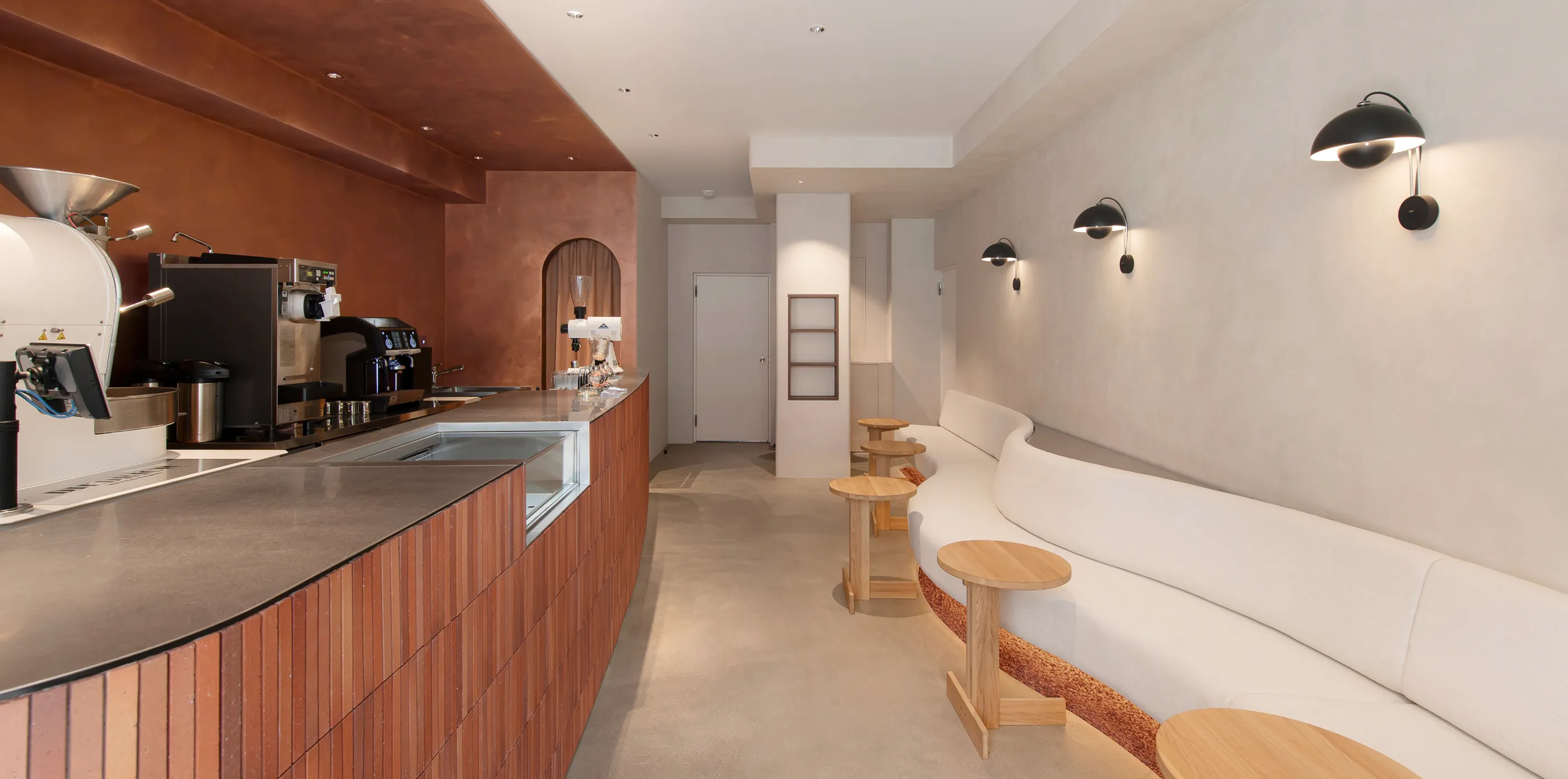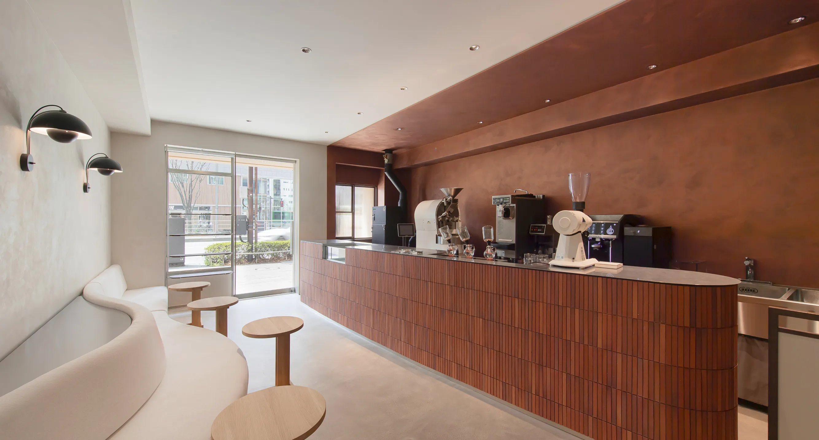 カウンターには焼きムラの表情を活かしたタイルや、その背面には左官のような風合いのある赤銅色の塗装とし、焼きあがりのクラストのような深みとハードな印象を表現した。一方で客席側は、白を基調とし柔らかく光の伸びる壁面と有機的な形状のソファにより、軽やかでやわらかいクラムの質感を感じさせる構成とした。